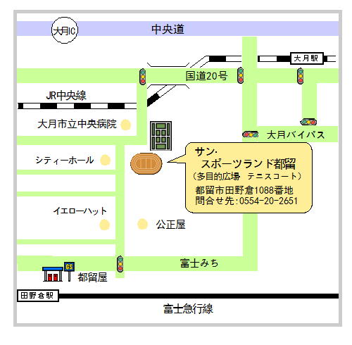 ※大月・都留市民以外の者が使用する場合の使用料の額は、当該使用料の2倍の額とする。 ・アクセス ●サン・スポーツランド都留 〒402-0001 山梨県都留市田野倉1088番地 アクセス経路 大月ICから車で5分